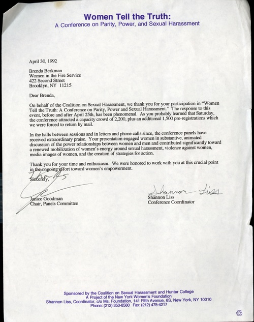 Letter thanking Brenda Berkman for her participation in the "Women Tell the Truth" sexual harassment conference