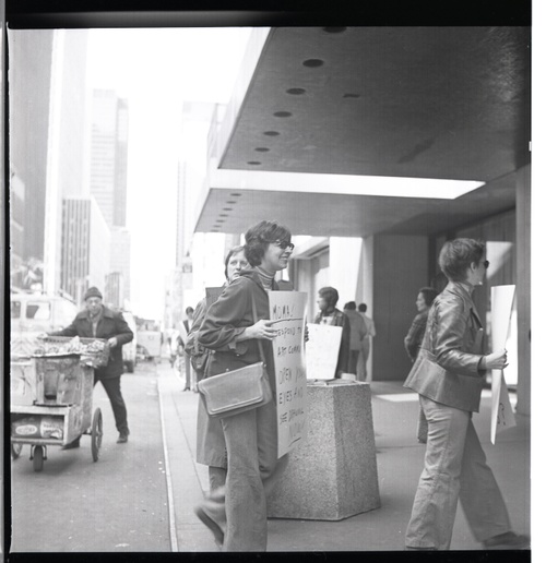 This is a photo of a demonstration by the MoMA and Guggenheim Ad Hoc Protest Committee for MoMA’s lack of women artists in its then current exhibition, Drawing Now. The protests took place in 1976.